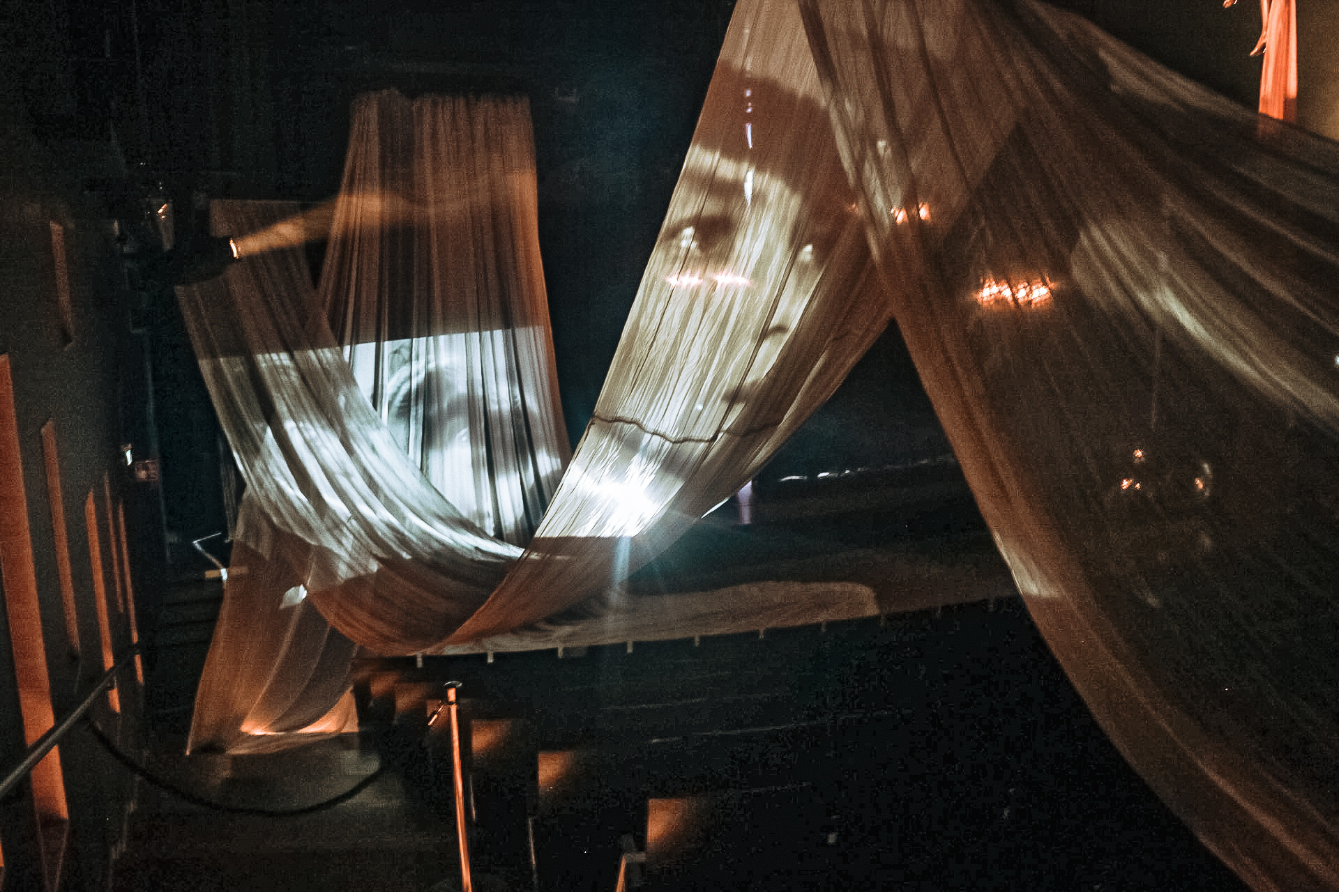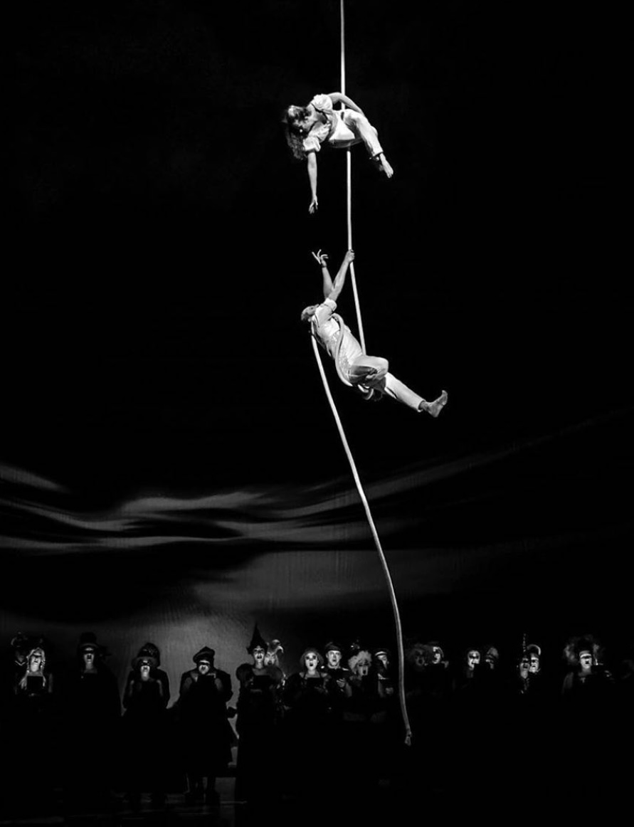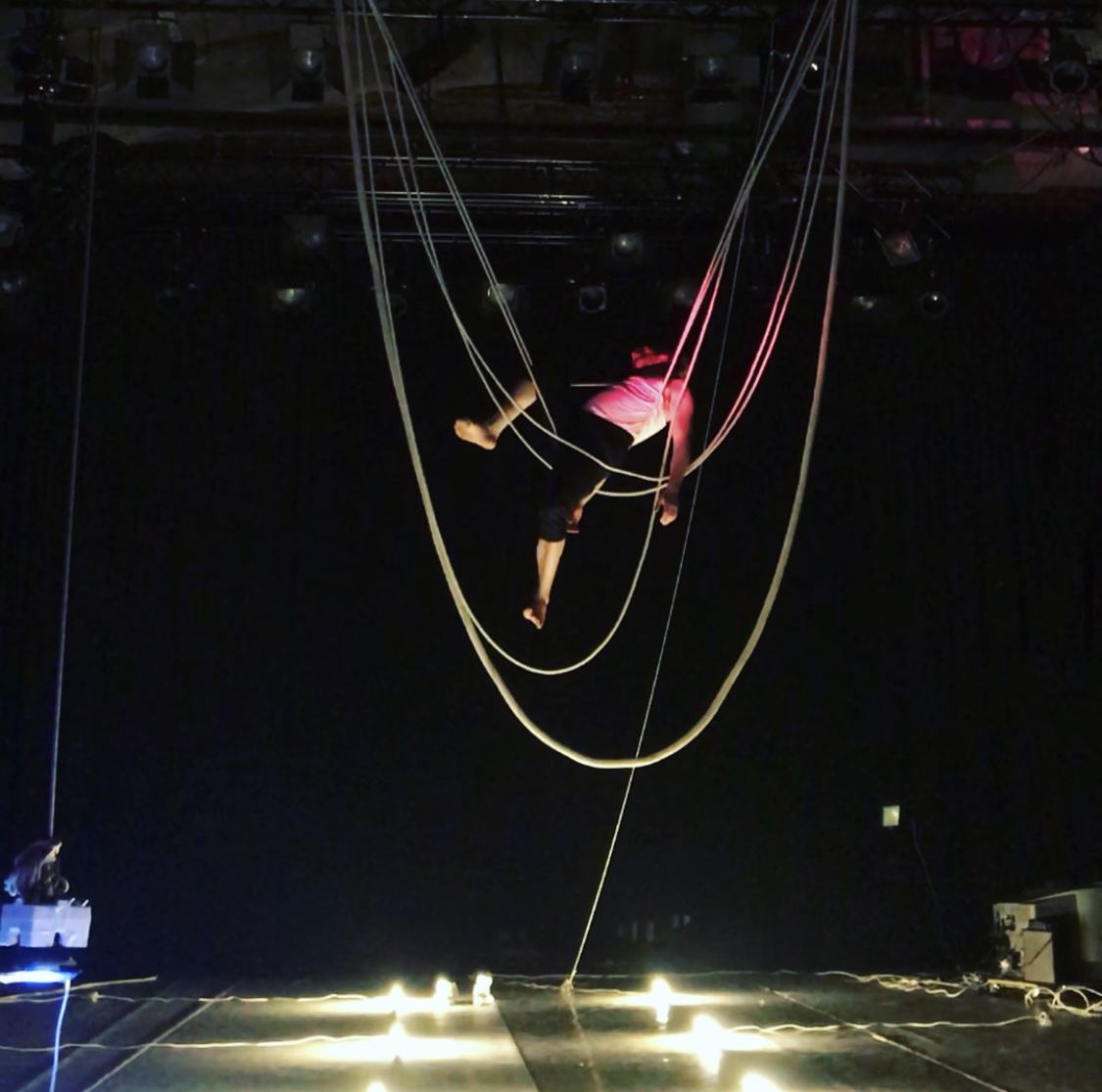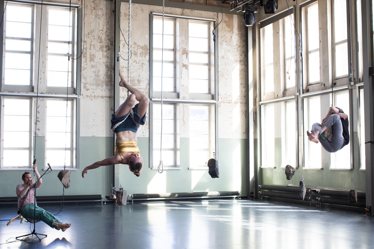 LIBRATIONS: A project combining contemporary music and circus explores the phenomena arising from the interference between two waves with only slightly different frequencies. The piece brings together two aerial acrobats, a contemporary music composer, and a soprano.